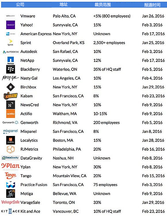 2015年10月中,增长乏力、创收无门的Twitter宣布计划裁员336人,约为全球雇员总数的8%;几乎同一时期,当红独角兽公司Snapchat也砍掉了自己的Snap Channel团队,原来重金挖来的福克斯高管离职,团队中15人被裁或辞职。此外,Zenput公司CEO兼联合创始人Vlad Rikher透露,到2016年年中,一些大型创业企业肯定会有裁员行动。而光在2016年头两月,据市场研究机构DataFox报告,就有23家科技公司宣布裁员,不仅包括Tango、NetApp等多家初创公司,老牌科技公司Yahoo、Vmware、黑莓也榜上有名。
