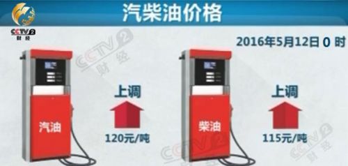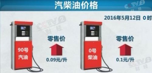 根据近期国际市场油价变化情况,按照现行成品油价格形成机制,自2016年5月12日0时起,国内汽、柴油价格(标准品,下同)每吨分别提高了120元和115元。全国平均来看,折合90号汽油每升上涨0.09元,0号柴油每升上涨0.1元,92号汽油每升上涨0.09元,95号汽油每升上涨0.1元。