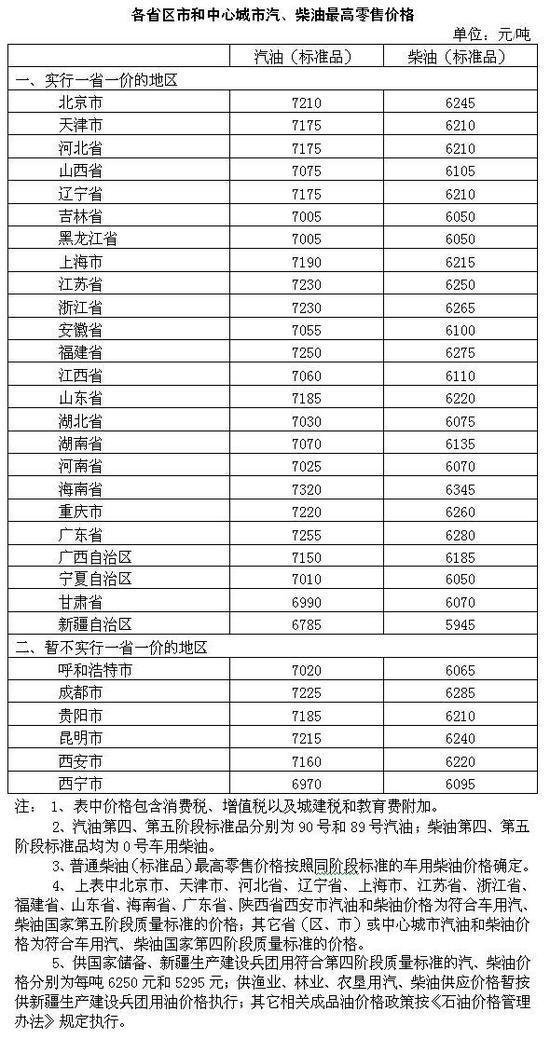 附:各省区市和中心城市汽、柴油最高零售价格表