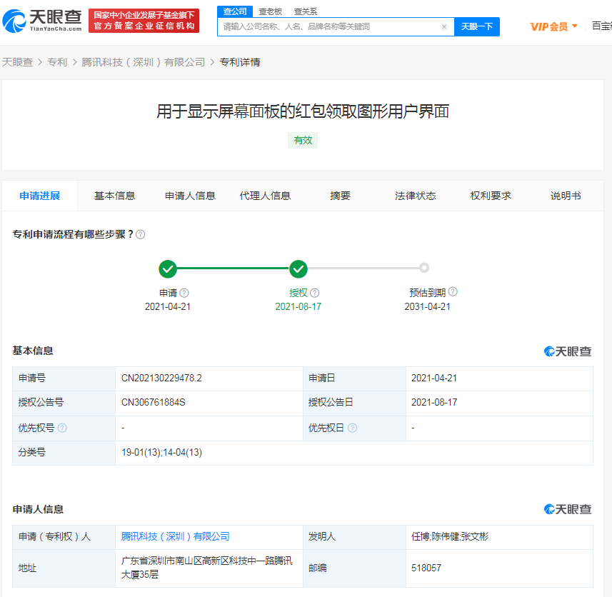 据天眼查APP显示,近日,腾讯科技(深圳)有限公司获得“用于显示屏幕面板的红包领取图形用户界面”专利授权,公告号CN306761884S,申请日期为2021年4月。专利摘要显示,该外观设计产品用于显示信息,设计要点的图形用户界面用于领取红包。当用户点击界面中“開”圆形控件时,金币绕其对称轴旋转,随后红包拆开,展示红包详情;当首个红包领取成功时,页面自动定位至下一个待领取的红包。