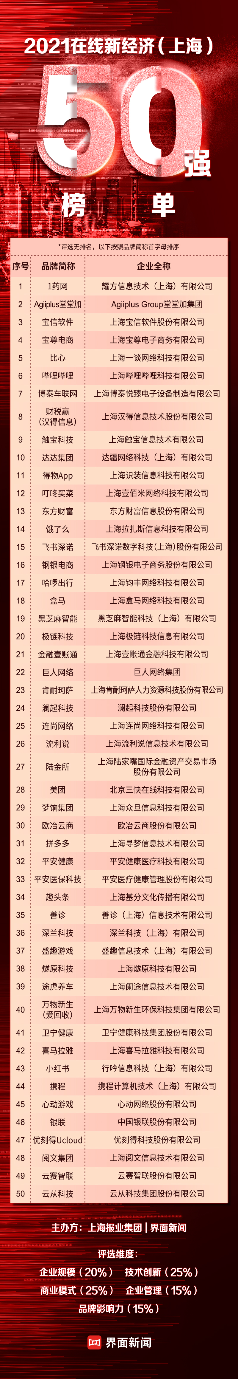2021在线新经济(上海)50强榜单由上海报业集团|界面新闻发起,旨在挖掘、梳理上海在线新经济领域的优秀企业。