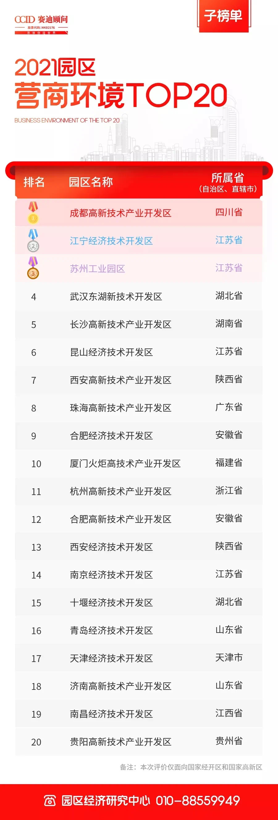 近日“园区高质量发展百强(2021)”榜单由赛迪顾问园区经济研究中心正式发布。榜单显示,四川省上榜3席,其中成都高新区位列第七位。值得一提的是,围绕“营商引领”单个维度,评价形成了“园区营商环境TOP20”,成都高新区位列营商环境首位。