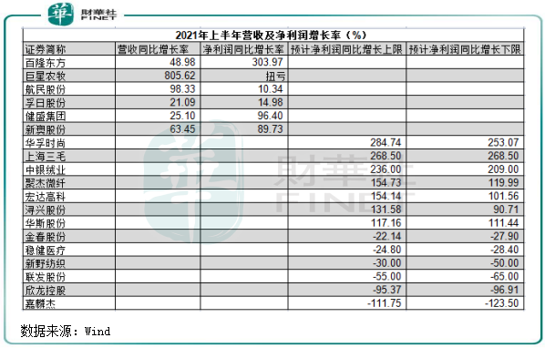 而已披露半年预报的其他纺织企业多数也获得了不俗的成绩,包括华孚时尚(002042.SZ)在内的6家企业预计净利润同比增长下限均超过100%,业内市值一哥中银绒业(000982.SZ)净利润预计增幅则超过200%。