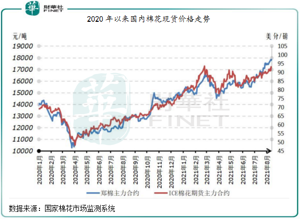 今年上半年以来,以棉花为主的原材料价格运行在两年内的最高位。自6月下旬以来,棉花开启新一轮趋势性上涨,至今累计涨幅超15%。截止8月16日,江苏、浙江等地区棉花现货价格已攀升至18100元/吨上方。此外,羊毛价也创下多年来的新高,中国濮院28支仿羊绒市场价格在7月初就突破32000元/吨大关。
