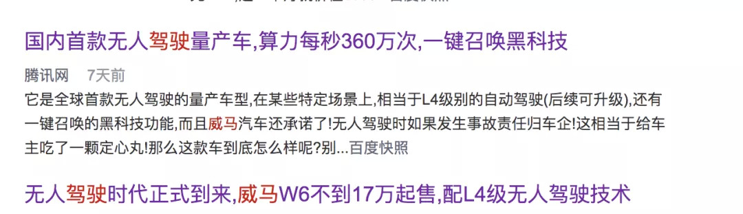 在蔚来车主的事故后,一向绝不落下热点的威马创始人沈晖谈及自动驾驶,认为“L2 级别责任在驾驶员,L4 以上级别自动驾驶功能,操作主体是车辆本身,责任主体归属主机厂。”并且又宣传了下自家的 L4 级别无人驾驶功能,因为选择了高频停车场景,环境封闭、相对低速,所以安全性更高。但他可能忘记了,威马新款车W6的宣传口径上写的是“国内首款无人驾驶量产车”。