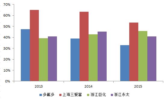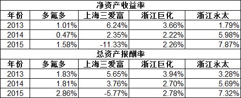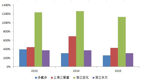 而四家上市企业在2015年的平均总资产周转率仅为43.26%,这在一定程度上反映出国内氟化工行业的实际产销营运情况仍不理想(据有关机构统计,2015年石油化工行业的平均资产周转率在100%以上)。