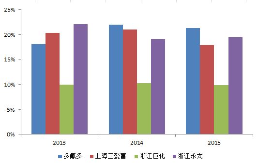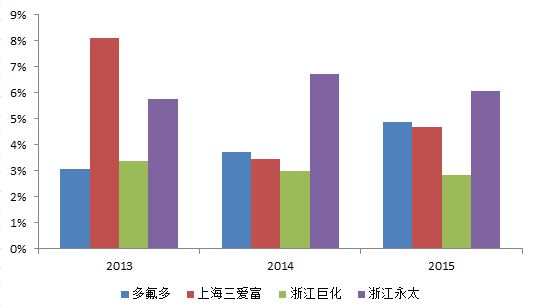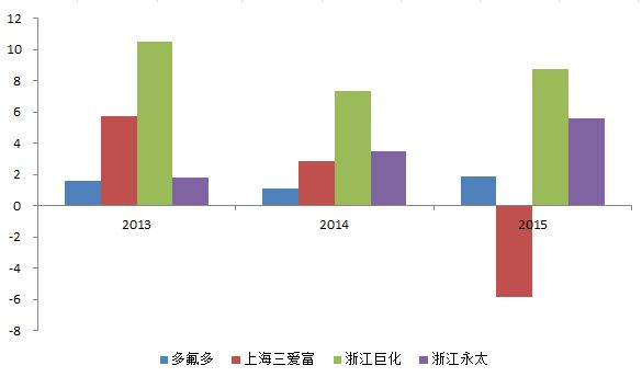 (1)从氟化工业务的营业增长率来看,浙江巨化和浙江永太增长幅度可观,分别为4.43%和20.27%,连续两年实现正增长;而上海三爱富和多氟多则为负增长(-1.24%和-0.03%)。不过,多氟多2015年的营业增长率较2014年时(-5.24%),已有了明显的改善。