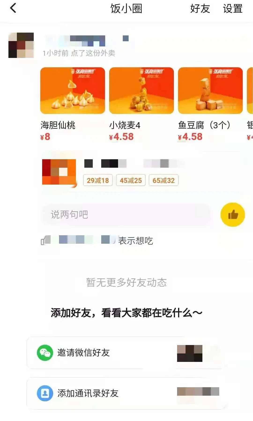 据媒体报道,“饭小圈”功能可以通过“微信分享”和“通讯录”两种方式添加好友。用户在“饭小圈”内可以查看好友的外卖订单分享、点评等信息,可以对该订单评论点赞,还可以“跟买”,节省点餐的选择成本。