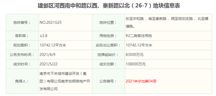 作为今年520集中供地出让的地块之一,5月20日,经过12轮报价,河西南G25地块被拍至最高限价,后经摇号,由下关城开、南京宏顺联合体竞得,总价10.8亿元,楼面价35907元/㎡,毛坯限价44440元/㎡,比香港嘉华G72毛坯限价上涨了440元/㎡。