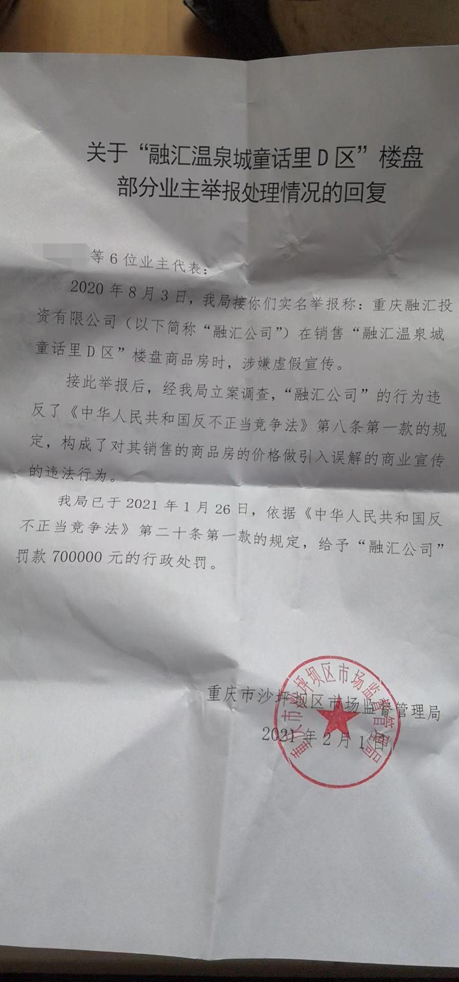 8月17日,界面重庆从业主的代理律师——重庆渝宏律师事务所的谢旭主任律师处得知,此前因一审败诉,上诉到市第一中级人民法院的当事业主,目前已经拿到了法院下发的二审判决书。判决结果为:融汇败诉,将赔偿业主两万元损失。