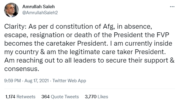 阿富汗第一副总统萨利赫8月17日在推特发文称,根据阿富汗宪法,在总统缺席,逃跑,辞职和死亡的情况下,副总统将成为看守总统。萨利赫表示,他目前在阿富汗境内,是合法的看守总统,他正寻求阿富汗其他领导人的支持和共识。