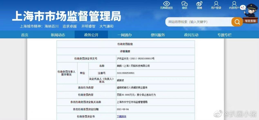 针对此行为,上海市长宁区市场监督管理局对美腕下发行政处罚决定书。处罚书中称,美腕涉及虚假或者引人误解的商业宣传的违法行为,责令其停止违法行为并罚款30万元。