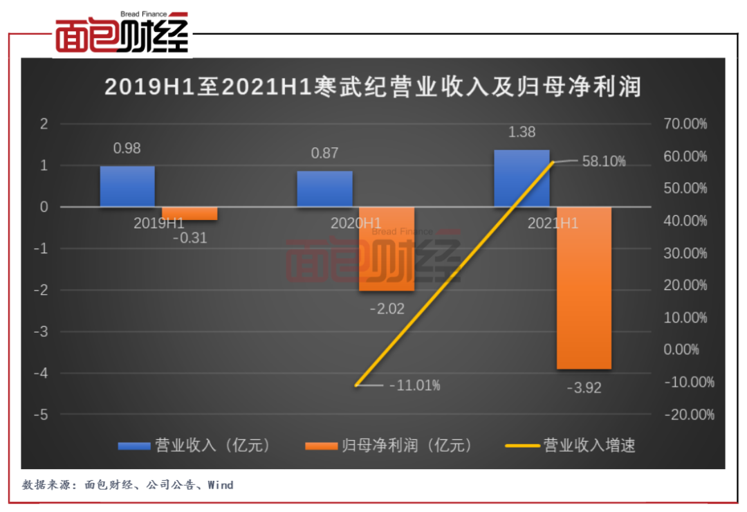 近日,寒武纪发布2021年半年度报告。上半年,公司实现营业收入1.38亿元,同比增加58.1%;归属于上市公司股东的净利润亏损3.92亿元,较上年同期亏损扩大1.9亿元。