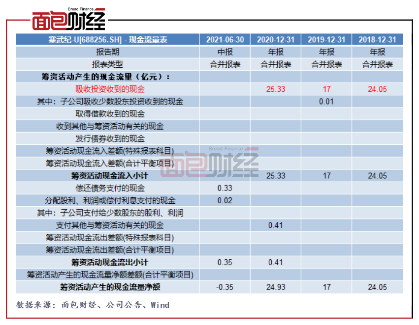 2021上半年,受业绩不景气影响,寒武纪经营活动现金流净流出5.39亿元。不仅仅是今年上半年,2019年度和2020年度公司经营活动现金流净流出分别为2.02亿元和1.32亿元,那么公司因经营活动惨淡净流出的现金靠什么来补血?