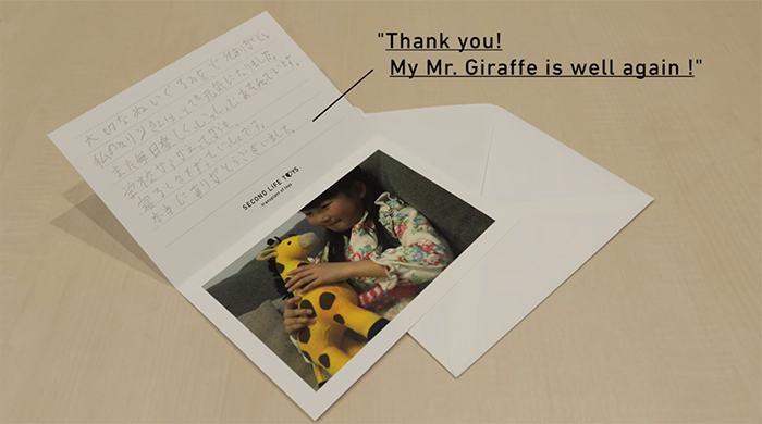捐献者将会收到来自玩具小主人的感谢信:谢谢你,让我的长颈鹿恢复了健康。