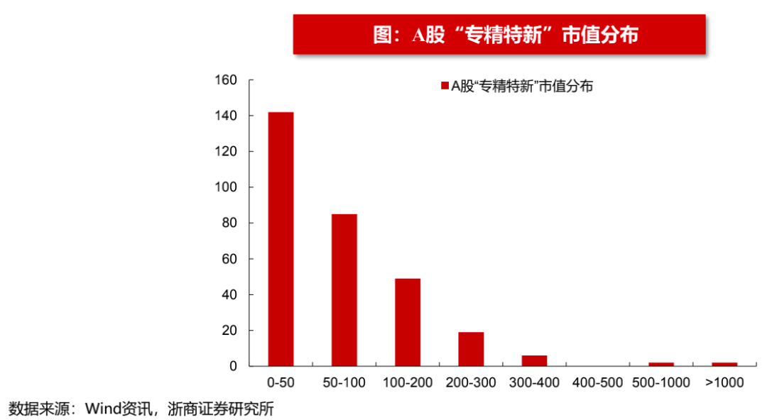 沪深股市中“专精特新”上市公司以百亿以内的公司为主。市值为 0-50 亿共 146家,占比高达 47.9%。市值在 100 亿以内共 237 家,占比 78%。
