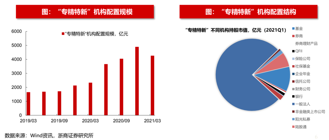 专精特新”机构配置的总规模在2021Q1约为4265亿元,占总市值的比重约为22%。