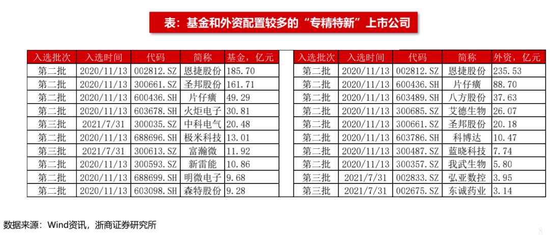 根据2021年Q2的数据,我们筛选了基金和外资配置较高的专精特新上市公司。