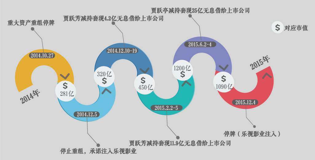 乐视网股价的一路水涨船高也让贾跃亭一路越跑越快。2015年5月,他借着市值在1000亿元左右的高点减持套现了将近8%的股份,套利约25亿元。虽然承诺全部借给上市公司用于补充现金,但这一手承诺注入=>抬高股价=>高位套现的资本运作可不是一般人能学会的。