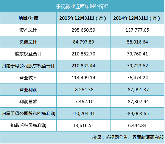 在预案中,最让人心动的莫过于承诺业绩了:标的公司承诺于2016年度、2017年度、2018年度归属于母公司股东的扣除非经常性损益后的净利润分别不低于5.2亿元、7.3亿元、10.4亿元。这份业绩承诺可真是不算低,要知道乐视网2015年扣非后的净利润也只有5.5亿元。回顾2011年成立的乐视影业,2015年实现收入11亿元,但是2015年归属于母公司净利润亏损1.02亿元,而2014年的亏损额更是高达8.9亿元。