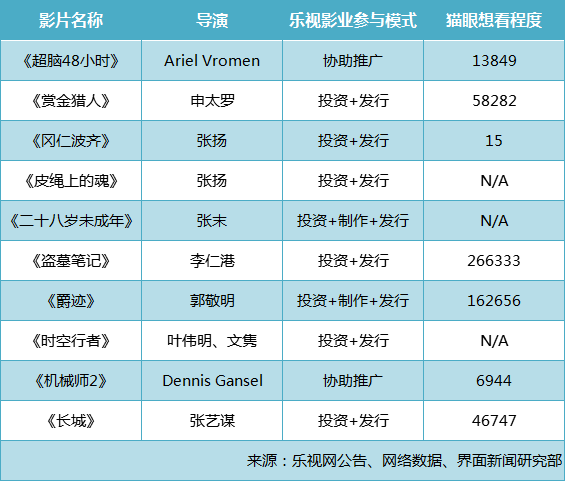 而乐视影业的决心远大于其能力。在交易预案中,乐视影业罗列了2016年即将上映的十部影片,包括申太罗的《赏金猎人》 、李仁港《盗墓笔记》、郭敬明的《爵迹》等。如果说5.2亿元的利润多数是依靠于这十部作品的话,不得不让人觉得乐视影业夸下的海口有些大了。一般而言票房成绩与影片的受关注度成正比,界面新闻根据猫眼的检测数据发现,这十部电影中仅有《盗墓笔记》以及《爵迹》两部电影受关注程度较高。主要靠这两部电影来实现5.2亿元的利润,实在是让人捏一把汗。