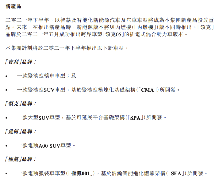 8月18日,吉利汽车在港交所公布中期业绩,2021年上半年营收450.32亿元,同比增长22%;净利润23.81亿元,同比增长4%。吉利汽车方面表示,计划将于下半年推出5款新车型,分别为2款“吉利”品牌车型(紧凑型轿车/紧凑型SUV)、1款“领克”品牌车型(大型SUV)、1款“几何”品牌车型(电动A00 SUV),以及1款“极氪”品牌车型(电动猎装车,即极氪001)。
