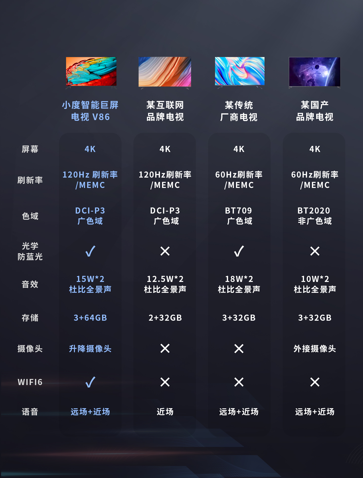 色彩显示上,小度电视V86采用93%的P3广色域,支持专业AI算法调校画质、HDR10和杜比视界。V86的屏幕采用了光学防蓝光灯珠,是光学防蓝光屏幕。