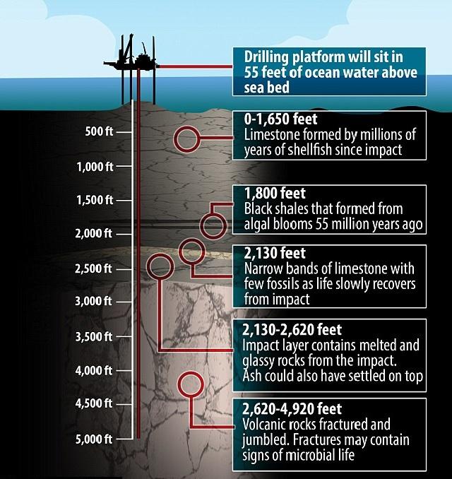 科学家认为在这颗小行星撞击地球后,爆发出了巨大的能量,引发了火山爆发、森林烧毁、海啸和气候聚变等灾难。有些科学家还认为,二氧化碳含量的上升还使得海洋的酸性增强,于是他们希望研究幸存的生物是否具有更高的耐酸性。
