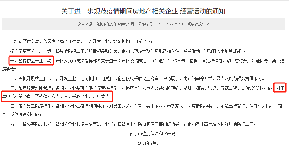 7月27日晚,南京市住房保障和房产局官网发布了《关于进一步规范疫情期间房地产相关企业经营活动的通知》。其中明确暂停开展公证摇号、集中选房等活动,售楼处也相继暂停开放接待。