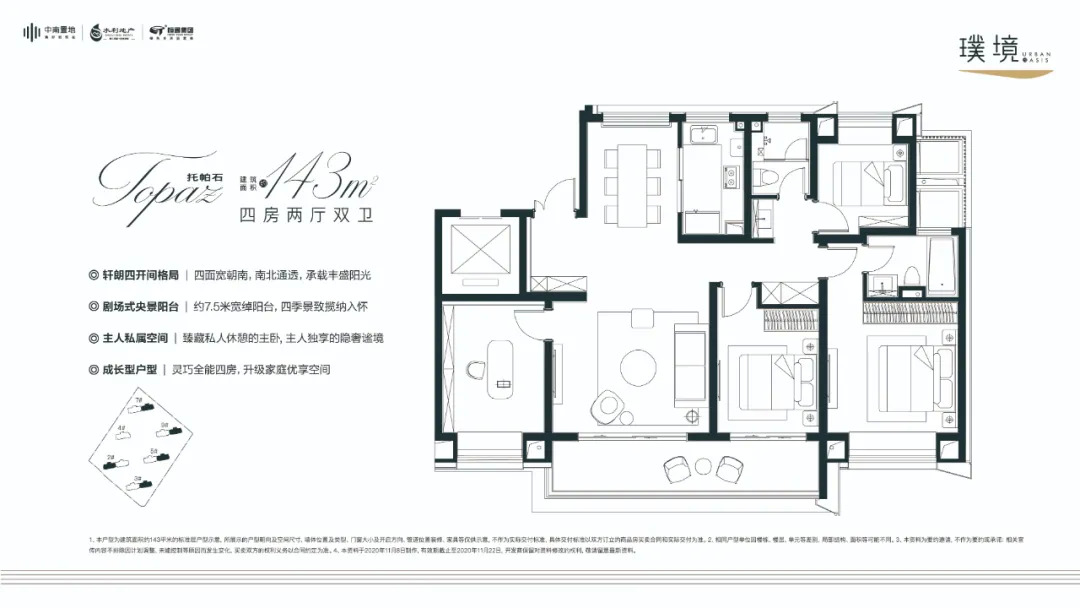 户型特色:143㎡的户型为四室两厅两卫设计,四开间朝南,约14.3米面宽,非常阔绰。南向次卧与客厅阳台连通,约5.7米的尺度,采光、观景效果更佳。主卧有独卫、带飘窗,南向的书房也可做次卧,可以根据不同家庭需求进行改造。
