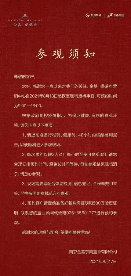 金基望樾府自8月18日恢复现场接待事宜,需致电预约并准备好购房证明和500万验资证明。