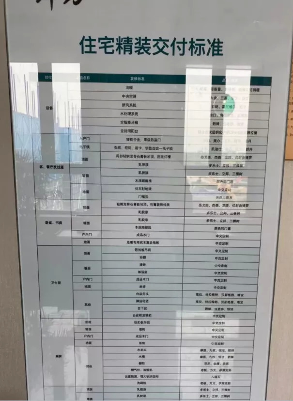 根据项目此前公布的精装标准,配有中央空调、新风、地暖三大件齐全,采用大金、威能、百朗、高仪、摩恩、老板、怡口、箭牌等精装品牌。