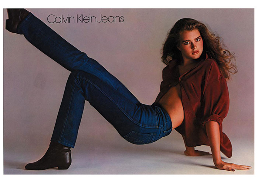 1980年,年仅14岁还没过完青春期Brooke Shields在广告里穿着牛仔裤摆出妖娆的姿势说:“You wanna know what comes between me and my Calvins? Nothing.”(你想知道我和Calvins之间隔着什么?我们亲密无间)。虽然在现在看来,那则广告实在算不上劲爆。但对当时的美国人来说,谁都没想到1岁不到就成为童星、一直被打扮成天真无邪的Brooke Shields,居然反转成叛逆又妩媚的“性感女郎”,还在电视上说着绵绵情话。