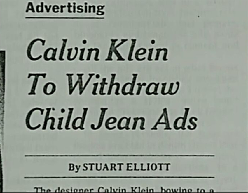 在1995年,在为牛仔服做广告宣传时,CK选用了一些未成年的模特,这引起了不少媒体的指责,甚至引起了当时美国总统克林顿的批评。CK不得不买下《纽约时报》整版的广告来道歉,并撤回了那些海报。这次的影响对CK来说是无法挽回的,多年来对这个品牌的积怨全部爆发出来。原来那些兴致勃勃穿CK以显示格调高的人,也不再愿意为它买单。到2000年的时候,CK不得不以打折促销为卖点。