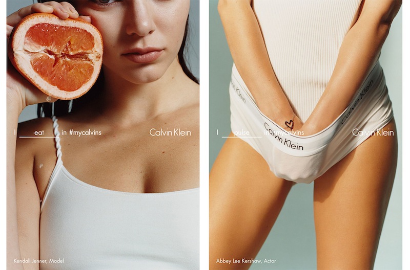 比如最近CK的一系列海报又在社交网络上引起了争论。21岁的Kendall Jenner用性感挑逗的姿势摆弄半颗葡萄柚,背景还被调成了暧昧的橘色。在另外一张海报里,模特躺在白色的地板上摆出S型,将手藏进了CK的内裤里。