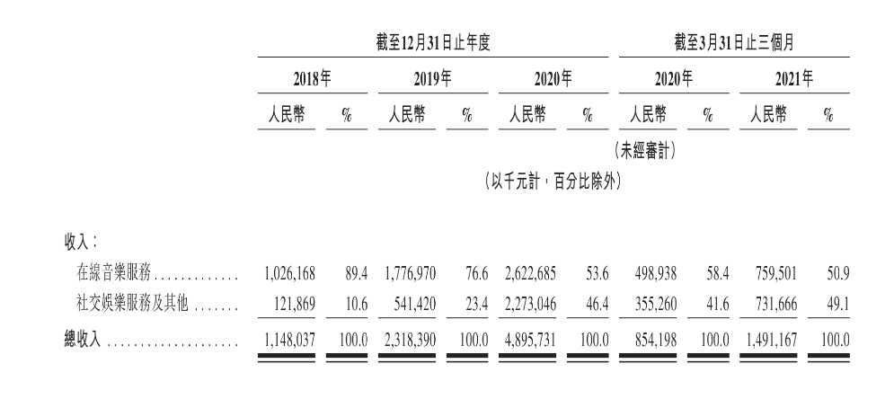 据「创业最前线」观察,网易云音乐正在越来越依赖社交娱乐服务。招股书显示,截止2018、2019、2020年底和2021年第一季度,网易云音乐在线音乐服务收入占总收比例逐年减少,而社交娱乐服务则分别实现了1.22亿元、5.41亿元、22.73亿元和7.32亿元,占总收入比例为10.6%、23.4%、46.4%和49.1%,成为和在线音乐服务比肩的又一增长动力。