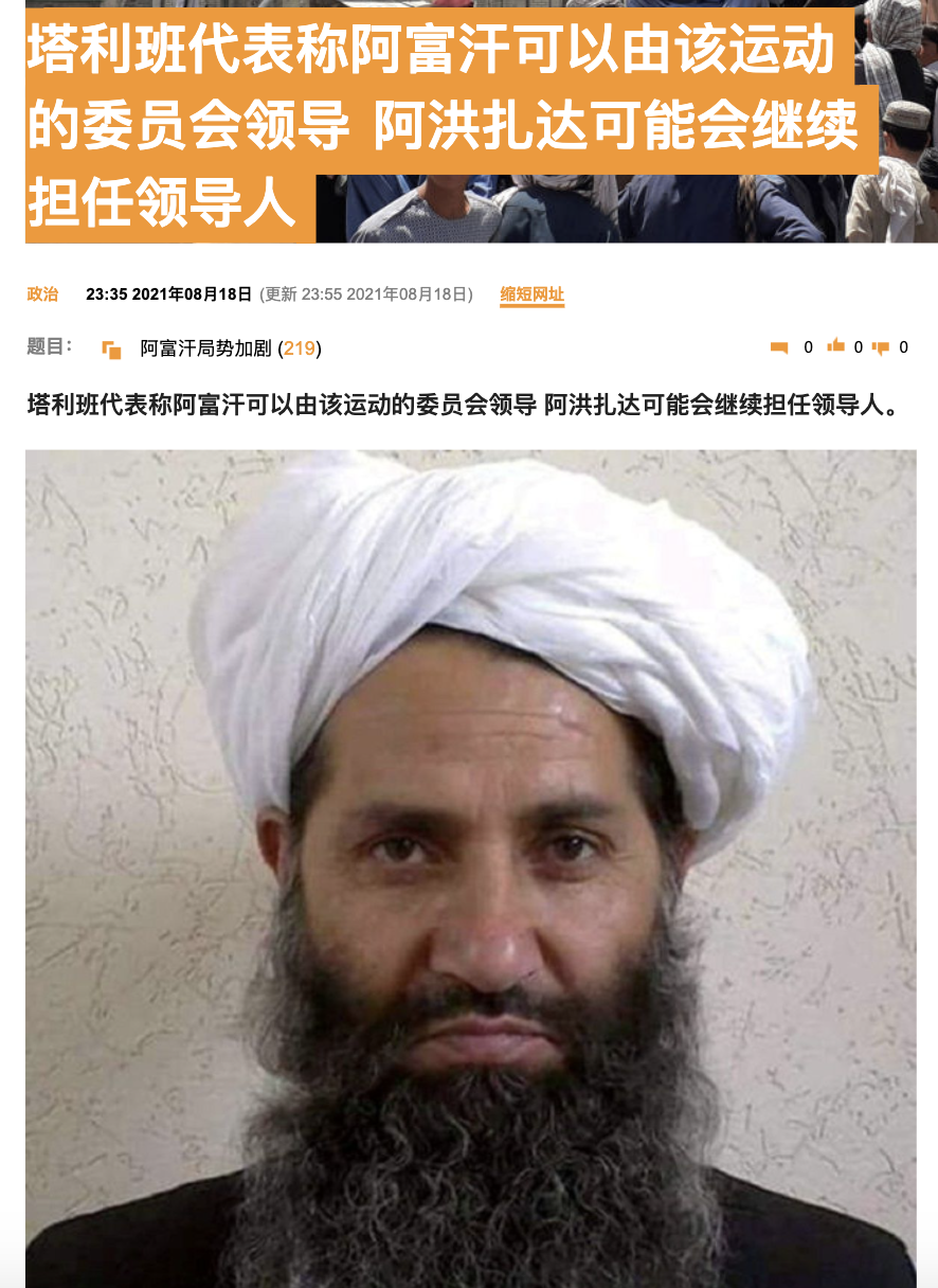 俄罗斯卫星通讯社8月18日消息,塔利班代表称,阿富汗可以由其委员会领导,阿洪扎达可能会继续担任领导人。