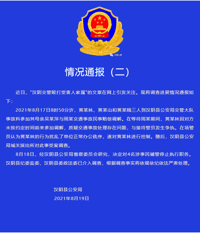 据陕西“汉阴公安”8月19日消息,近日,“汉阴交警殴打受害人家属”的文章在网上引发关注。现将调查进展情况通报如下: