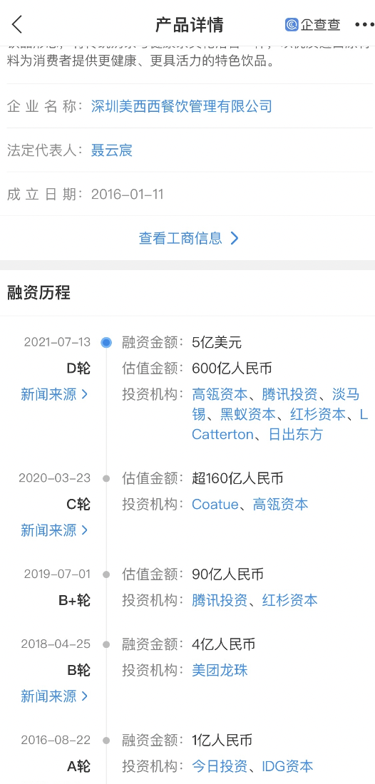 此后,喜茶进入了两条线高速发展的阶段。一条是线下开店,速度越来越快;另一条是对资本市场的经营。2018年B轮之后,喜茶保持着每一年一次的融资节奏和频率,估值也从2019年7月B+轮的90亿人民币,一路高歌猛进,跳跃到了2021年7月D轮的600亿人民币。