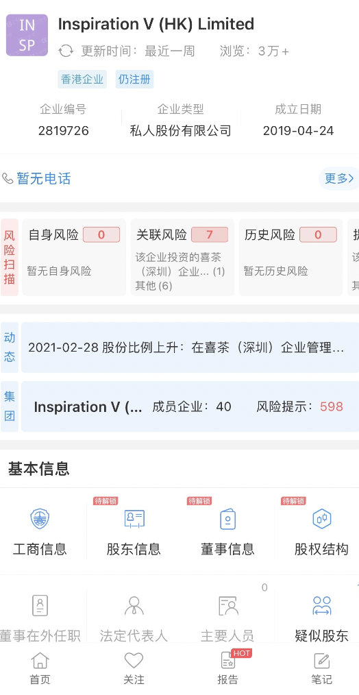 根据天眼查,Inspiration V (HK) Limited 成立于2019年4月24日,注册地香港。Inspiration V (HK) Limited的疑似实际控制人为NEONIE LIMITED,关于NEONIE LIMITED的信息更是少之又少。而NEONIE LIMITED的两笔公开投资,一笔是Inspiration V (HK) Limited,一笔是香港喜創於茶有限公司。公开资料显示,香港喜創於茶有限公司,注册于中西文咸东街,性质还是私人股份有限公司。