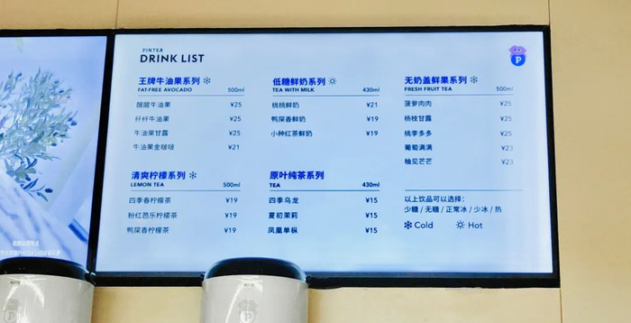 而PINTEA整体的产品定位,是注重“无奶盖、无脂肪、无添加”的鲜果茶,甄选当季低热低糖和“刮油水果”,口感清爽,符合目标人群的喜好。