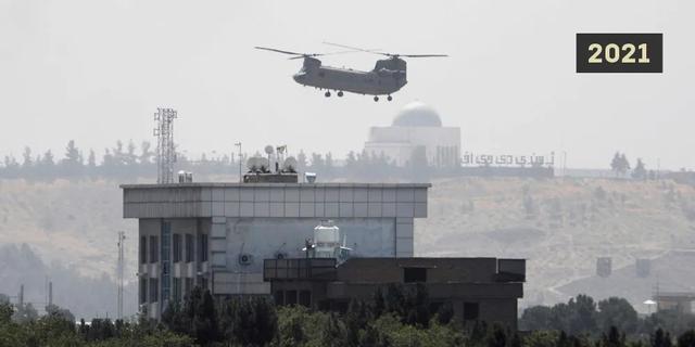 ▲ 2021年8月15日清晨,美军CH-47“支奴干”双旋翼直升机飞抵美国驻阿富汗大使馆上空,撤离美方工作人员。