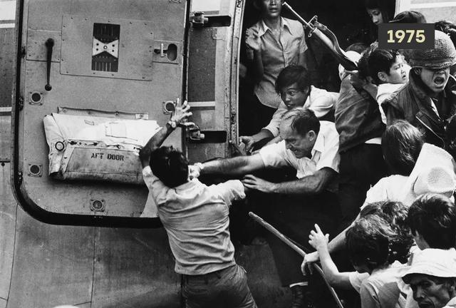 ▲ 1975年,“西贡铁拳”:一名南越人竭尽全力试图登上直升机,舱门口的美国使馆工作人员一拳把他打了下去。