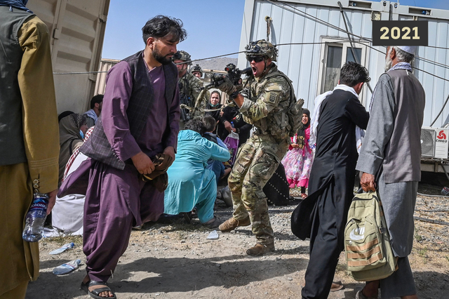 ▲ 2021年,“从实力地位出发”:在喀布尔卡尔扎伊国际机场,一名美军士兵咆哮着端起枪指向手无寸铁的阿富汗民众。