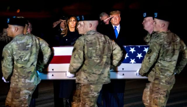 ▲ 2019年11月,时任美国总统特朗普和第一夫人梅拉尼娅在特拉华州的多佛空军基地迎接美军遗体。