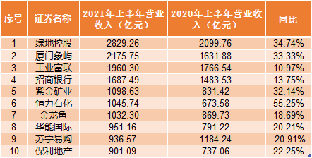 营业收入前十名2021年上半年营业收的平均涨幅为22.04%,其中9家为同比增长。