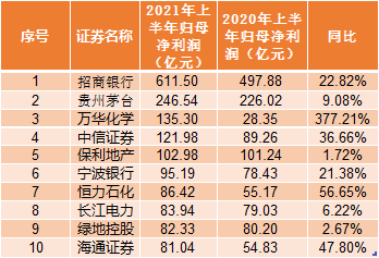 与收入榜单排名有所不同,上半年归母净利润第一名为招商银行,其归母净利润达611.5亿元,同比增长22.82%。贵州茅台则是在上半年赚了246.54亿元,目前暂居第二名。万华化学则突飞猛进,2021年上半年归母净利润同比增长377.21%,达到135.3亿元位居第三名。