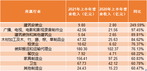 2021年上半年营业收入同比增速前十名的行业分别是增速为249.59%的建筑安装业、97.45%的广播、电视、电影和影视录音制作业、89.81%的建筑装饰和其他建筑业、84.62%的木材加工及木、竹、藤、棕、草制品业、76.37%的租赁业、76.13%的装卸搬运和运输代理业、68.22%的餐饮业、60.83%的家具制造业、60.78%的卫生、60.47%的其他制造业。