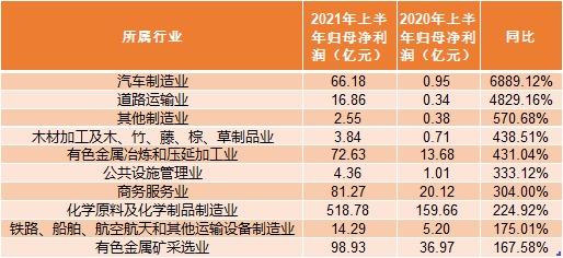 2021年归母净利润同比增速前十名的行业则分别是增速为6889.12%的汽车制造业、4829.16%的道路运输业、570.68%的其他制造业、438.51%的木材加工及木、竹、藤、棕、草制品业、431.04%的有色金属冶炼和压延加工业、333.12%的公共设施管理业、304.00%的商务服务业、224.92%的化学原料及化学制品制造业、175.01%的铁路、船舶、航空航天和其他运输设备制造业、167.58%的有色金属矿采选业。