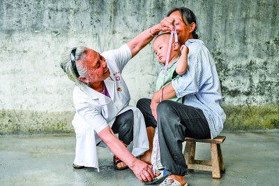 广西贺州市钟山县两安瑶族乡竹梅村的乡村医生王秋姣上门体检时给小朋友测量身高。新华社发